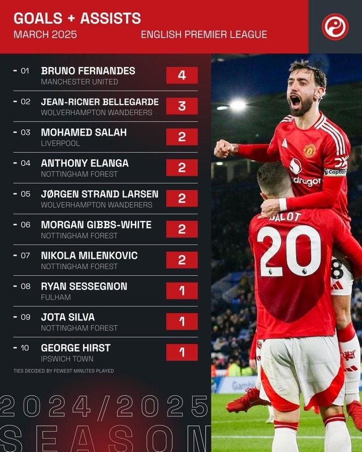 4月1日 據(jù)Squawka統(tǒng)計,B費參與了曼聯(lián)在三月份英超聯(lián)賽中所有的4個進球,這在英超球員中排在第一位。