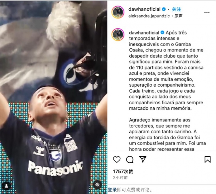 非常感謝球迷們,你們一直熱情地支持著我,你們的歡呼時刻讓我充滿力量。很榮幸能夠在這里效力,并成為這里歷史的一部分。非常感謝你,大阪鋼巴!