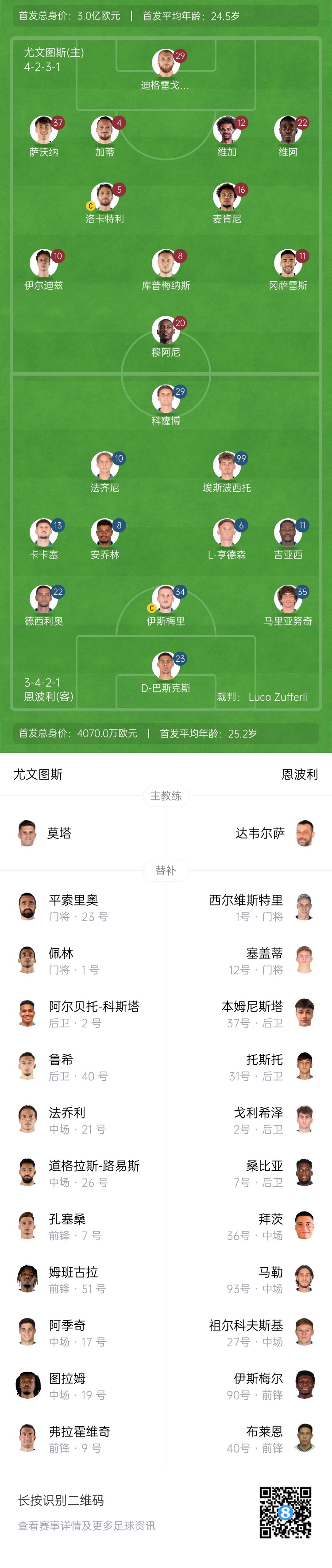 尤文首發(fā):29-迪格雷戈里奧、4-加蒂、37-薩沃納、12-維加、5-洛卡特利、8-庫(kù)普梅納斯、11-尼古拉斯-岡薩雷斯、16-麥肯尼、22-維阿、10-伊爾迪茲、20-穆阿尼