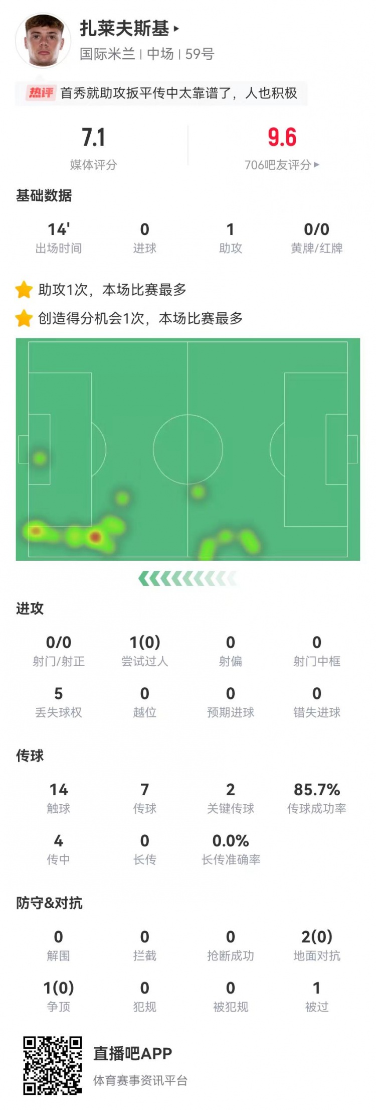 2月3日訊 國(guó)米在本輪意甲1-1戰(zhàn)平米蘭,扎萊夫斯基首秀數(shù)據(jù)如下: