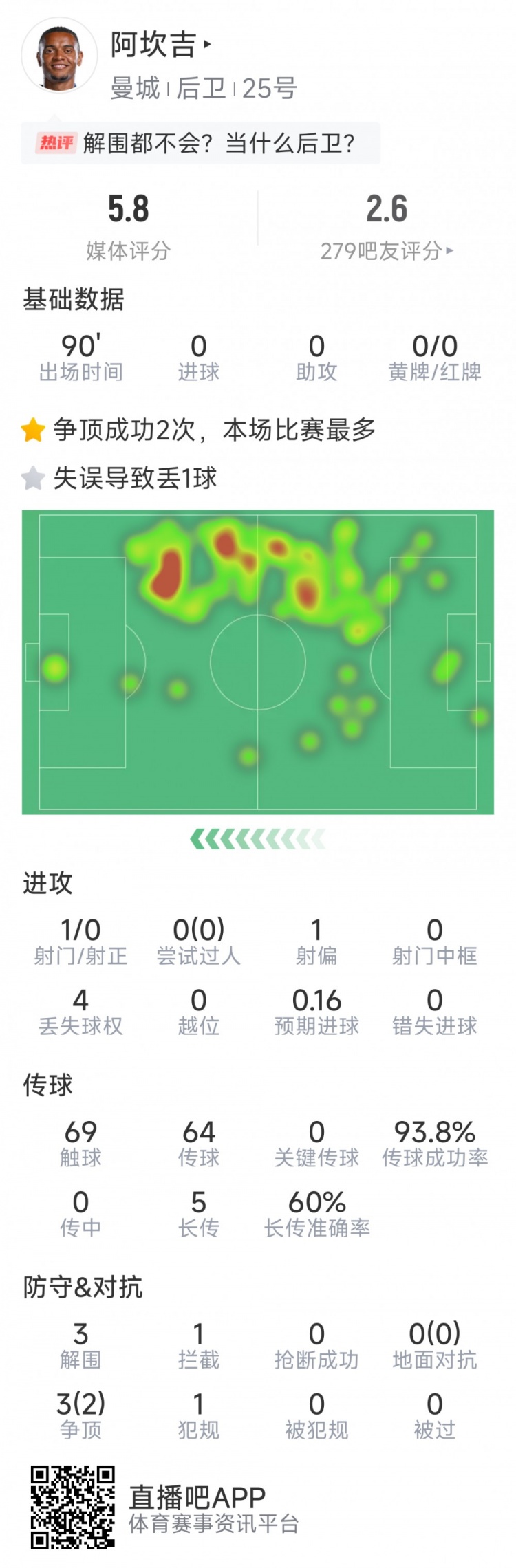 2月3日訊 在本輪英超,曼城1-5不敵阿森納。本場比賽阿坎吉開場失誤送禮,以下為他在本場數(shù)據(jù):比賽時間90分鐘1次射門69次觸球傳球成功率93.8%3次解圍1次攔截3次對抗2次成功sofa評分5.8分 本文標簽: 足球 英超 曼城