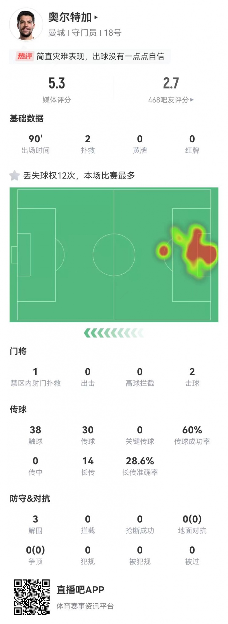 2月3日訊 曼城在本輪英超1-5慘敗阿森納,奧爾特加本場數(shù)據(jù)如下:首發(fā)踢滿全場2撲救、1撲救禁區(qū)內射門預期撲出-2.11球(門將若正常發(fā)揮應該是正值)2拳擊球1失誤導致丟球38觸球30傳球、18成功,成功率60%14長傳、4成功3解圍獲評5.3分全場最低 本文標簽: 足球 英超 阿森納 曼城