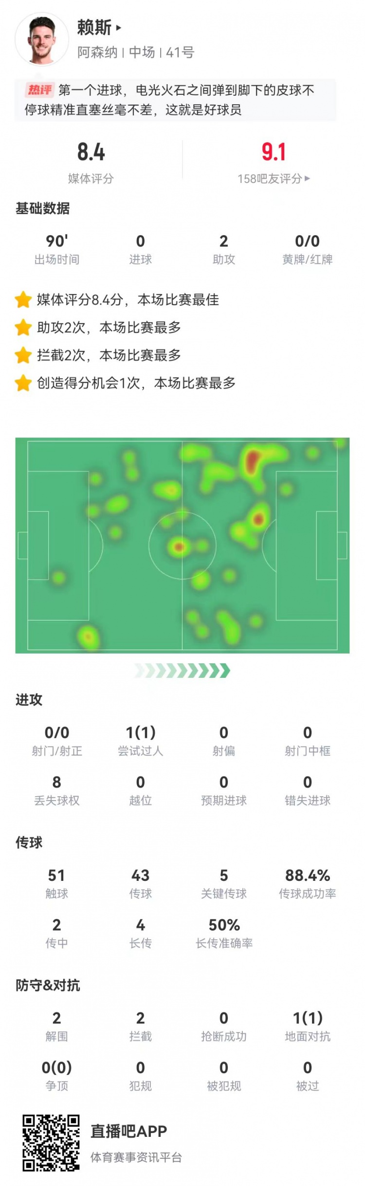 2月3日訊 阿森納在本輪英超焦點(diǎn)戰(zhàn)5-1大勝曼城,賴斯本場數(shù)據(jù)如下:首發(fā)踢滿全場2助攻預(yù)期助攻0.1951觸球43傳球、38成功,成功率88%5關(guān)鍵傳球2傳中、0成功4長傳、2成功1創(chuàng)造重大機(jī)會(huì)1過人、1成功1對抗、1成功8丟失球權(quán)2解圍2攔截獲評8.4分全場最高 本文標(biāo)簽: 足球 英超 阿森納 曼城