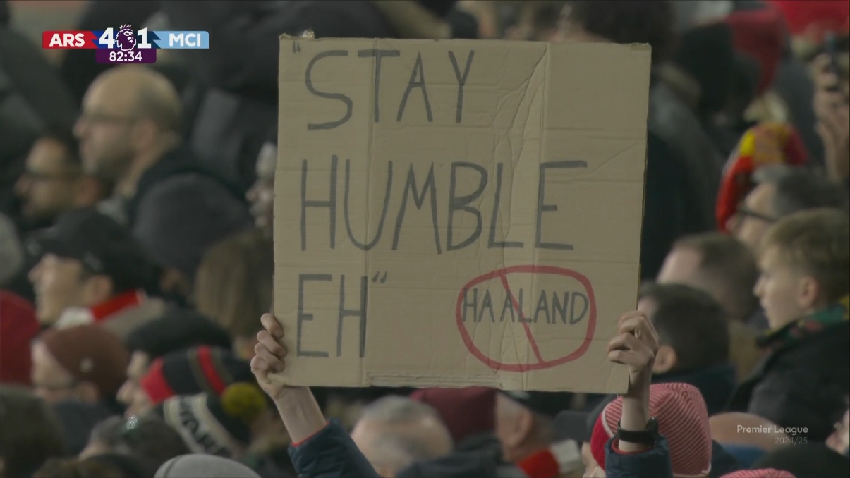 殺人誅心!看臺(tái)阿森納球迷高舉標(biāo)語:stay humble哈蘭德