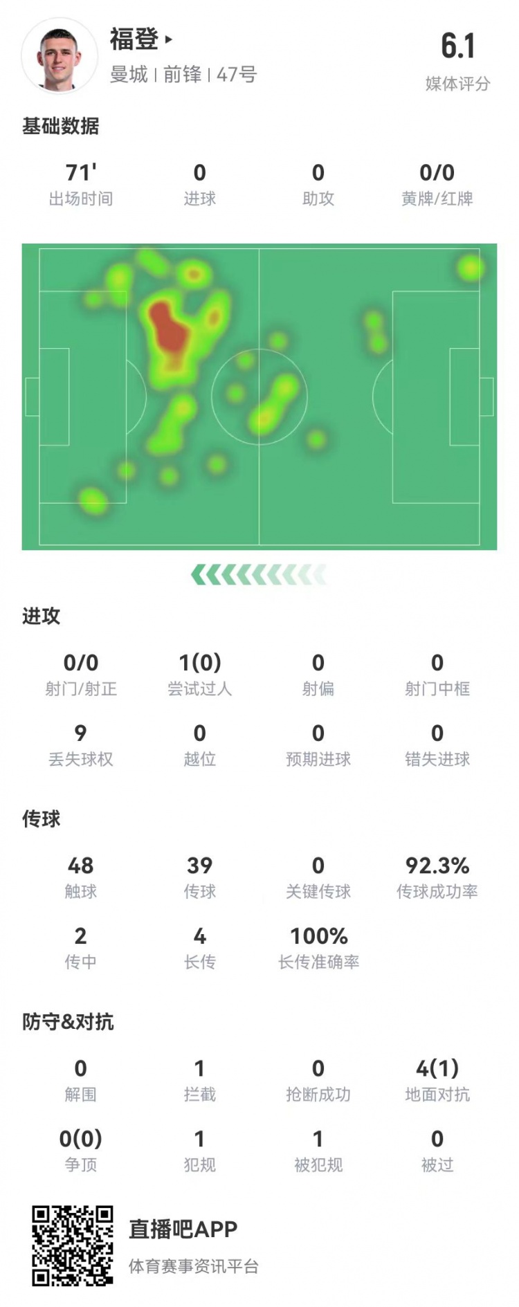 2月3日訊 阿森納在本輪英超主場對(duì)陣曼城,福登本場數(shù)據(jù)如下:首發(fā)出戰(zhàn)71分鐘48觸球39傳球、36成功,成功率92%2傳中、0成功4長傳、4成功1過人、0成功4對(duì)抗、1成功9丟失球權(quán)1犯規(guī)1造犯規(guī)1攔截1失誤導(dǎo)致丟球獲評(píng)6.1分 本文標(biāo)簽: 足球 英超 曼城 阿森納