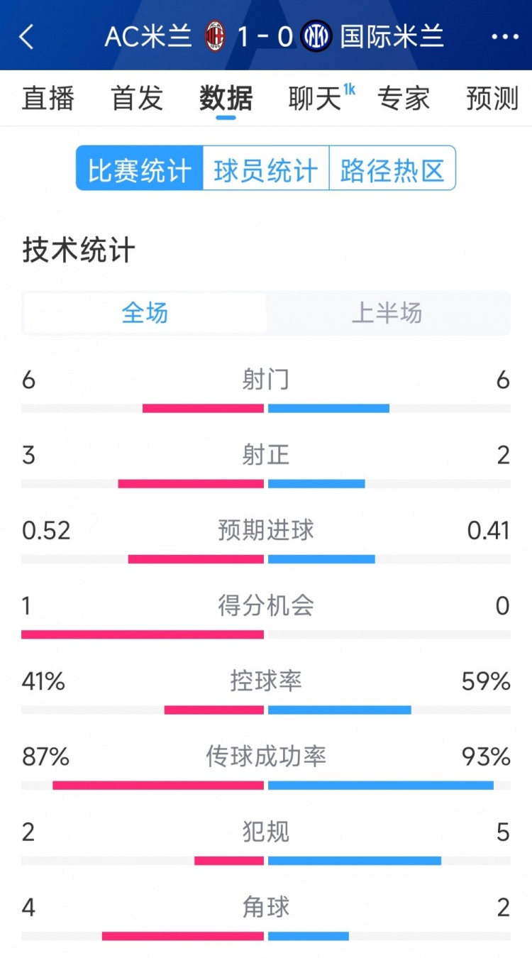 2月3日訊 在本輪意甲米蘭德比半場戰(zhàn)罷,AC米蘭暫時(shí)1-0領(lǐng)先,以下為雙方半場數(shù)據(jù)對比:AC米蘭vs國米射門:6-6射正:3-2預(yù)期進(jìn)球:0.52-0.41得分機(jī)會(huì):1-0控球率:41%-59%傳球成功率:87%-93%犯規(guī):2-5角球:4-2 本文標(biāo)簽: 足球 意甲 AC米蘭 國際米蘭