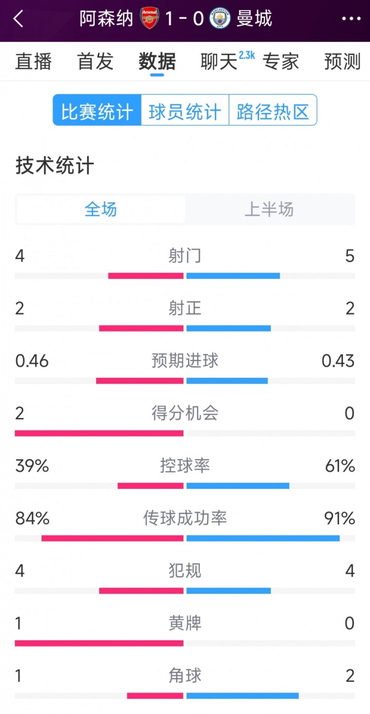 2月3日訊 在本輪英超焦點(diǎn)戰(zhàn),曼城對(duì)陣阿森納半場(chǎng)結(jié)束,阿森納憑借厄德高進(jìn)球1-0領(lǐng)先。以下為雙方半場(chǎng)數(shù)據(jù)對(duì)比: