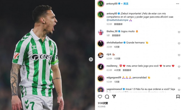 安東尼也在賽后通過社媒曬出慶祝照并配文:“關(guān)鍵的處子秀!很高興能夠和隊友們一起為眼前的球迷們奮戰(zhàn)?!?/p>