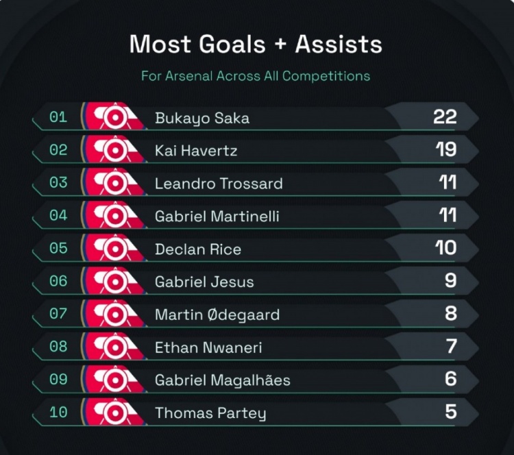 2月3日訊 英超第24輪比賽,阿森納主場5-1擊敗曼城。據(jù)Squawka統(tǒng)計,本賽季5名阿森納球員參與進球10+,其中薩卡參與22球最多,哈弗茨參與19球第二多。本賽季阿森納球員參與進球榜(所有賽事):薩卡——22哈弗茨——19特羅薩德——11馬丁內(nèi)利——11賴斯——10熱蘇斯——9厄德高——8恩瓦內(nèi)里——7加布里埃爾——6托馬斯——5 本文標(biāo)簽: 足球 英超 阿森納
