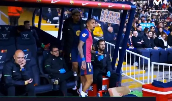 2月3日訊 本輪西甲,巴薩1-0小勝阿拉維斯,Movistar鏡頭拍到,拉菲尼亞在下場(chǎng)時(shí)對(duì)裁判的判罰表達(dá)了不滿。