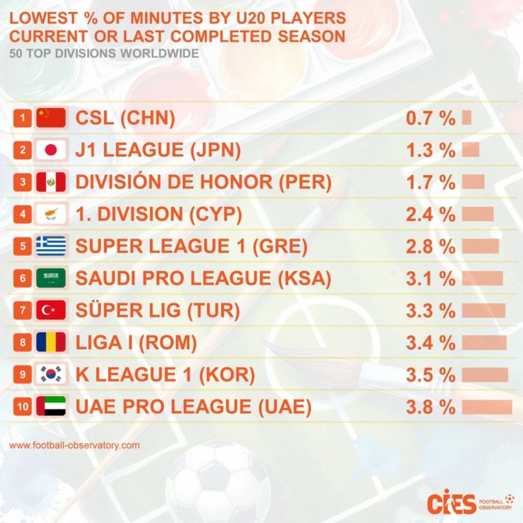 CIES統(tǒng)計數(shù)據(jù)基于當前賽季(非跨年賽事如中超則為2024賽季)出生于2004年以后的球員在所有比賽出場時間百分比。中超以0.7%排在“第一”,日本J聯(lián)賽、秘魯聯(lián)賽緊隨其后,沙特、韓國等聯(lián)賽同樣榜上有名。