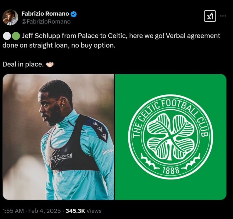 2月4日訊 名記羅馬諾用標志性的here we go確認,水晶宮中場施魯普將以租借形式加盟凱爾特人。