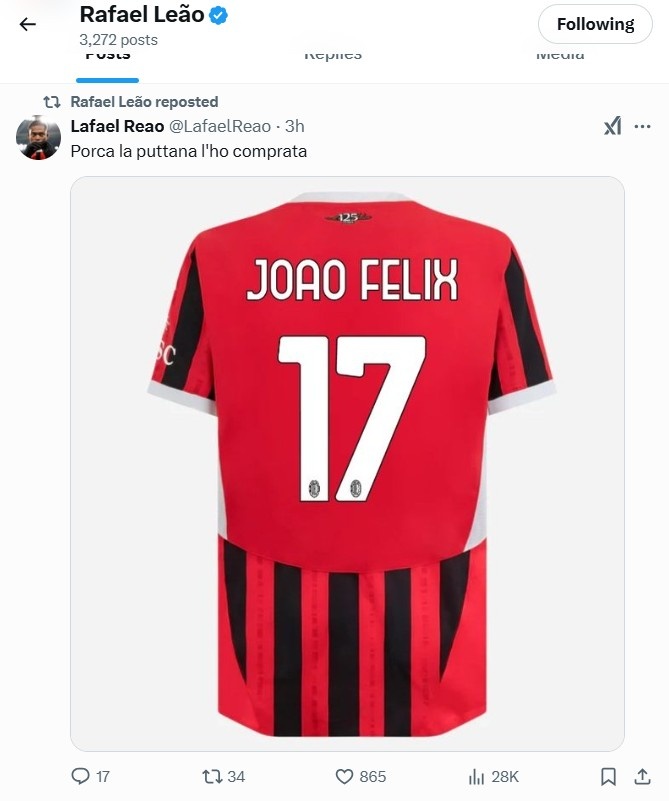 2月4日訊 羅馬諾報道,切爾西前鋒菲利克斯將租借加盟米蘭。米蘭邊鋒萊奧在社媒上轉(zhuǎn)發(fā)了一則動態(tài),動態(tài)中這位米蘭球迷博主表示道:“該死,我買了這件球衣”。圖片中是米蘭本賽季的球衣,印的名字是菲利克斯,印號是17號。 本文標(biāo)簽: 足球 英超 切爾西 意甲 AC米蘭