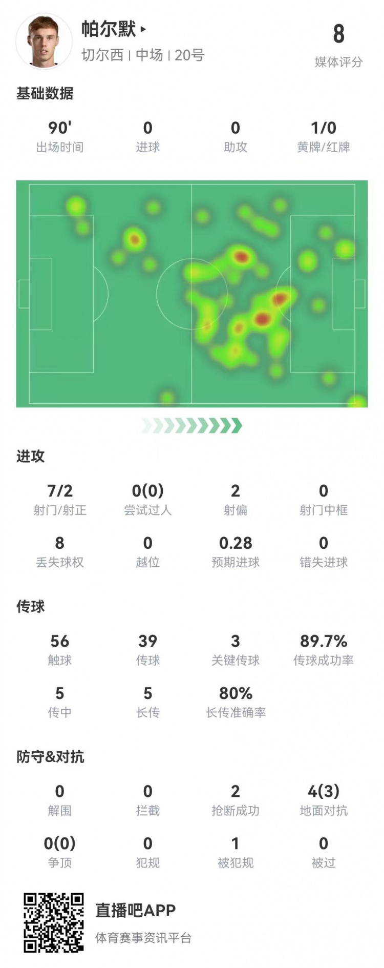 2月4日訊 切爾西在本輪英超2-1領(lǐng)先西漢姆,帕爾默本場數(shù)據(jù)如下: