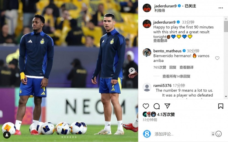2月4日訊 在北京時間今天凌晨進行的亞冠比賽中,杜蘭首秀踢滿90分鐘,利雅得勝利4-0擊敗迪拜祈禱。杜蘭在社交媒體上曬出與C羅的合照,并寫道:“很高興身穿這件球衣踢滿90分鐘,并在今晚取得很棒的結(jié)果?!?/p> 本文標簽: 足球 C羅 利雅得勝利