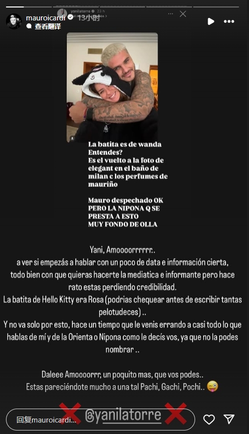 伊卡爾迪寫道:雅尼(下圖右邊為伊卡爾迪說的 Yanina Latorre),你想成為一名媒體人、消息人士,這很好,但用事實和證據(jù)說話。你正在失去信譽,Hello Kitty的睡衣是粉色的,寫這么多之前你能檢查下嗎?