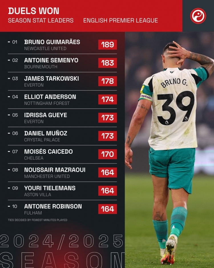 3月18日訊 國家隊比賽周到來,英超也暫時告一段落,squakwa統(tǒng)計了本賽季英超成功對抗情況,吉馬良斯居首。