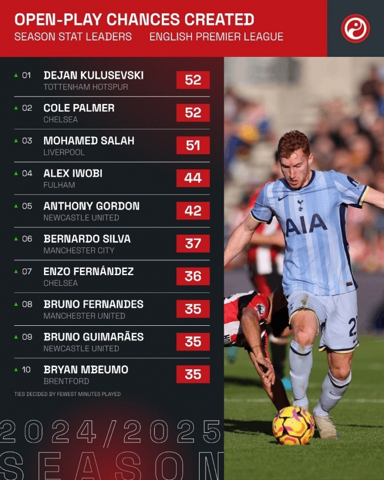 本賽季英超運(yùn)動(dòng)戰(zhàn)創(chuàng)造機(jī)會(huì)榜: