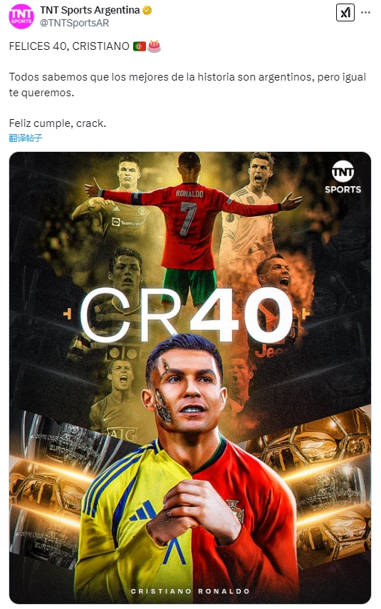02月05日訊 今天是C羅的40歲生日,TNT體育阿根廷頻道發(fā)文為C羅慶生。TNT體育阿根廷頻道寫道:克里斯蒂亞諾,40歲生日快樂(lè)????????????我們都知道歷史最佳球員都是阿根廷人,但我們依然愛(ài)你。生日快樂(lè)。 本文標(biāo)簽: 足球 C羅 梅西 利雅得勝利