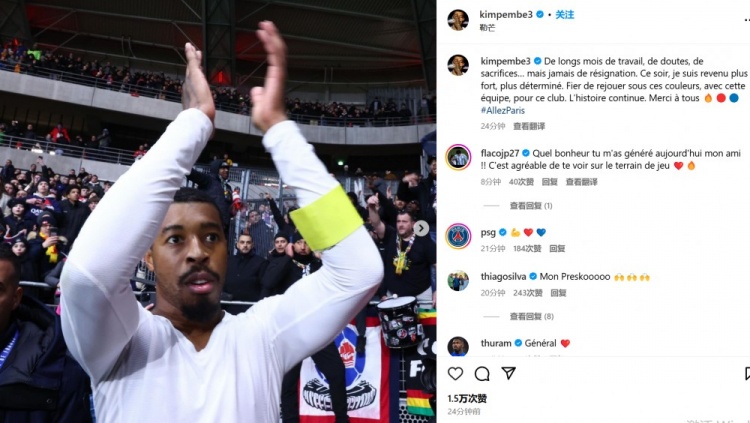 2月5日訊 巴黎在本輪法國杯2-0擊敗勒芒,29歲的中衛(wèi)金彭貝時隔2年終于復出。他也在賽后通過社媒曬出自己賽后的謝場照,并表示:“多少個月的努力訓練、自我懷疑和不懈付出,我從未放棄。今晚,我回來了,變得更強也更為堅定。我很自豪能夠再次身穿這件球衣,和隊友共同為俱樂部效力。故事還在繼續(xù),謝謝大家?!?/p> 本文標簽: 足球 法甲 巴黎圣日耳曼