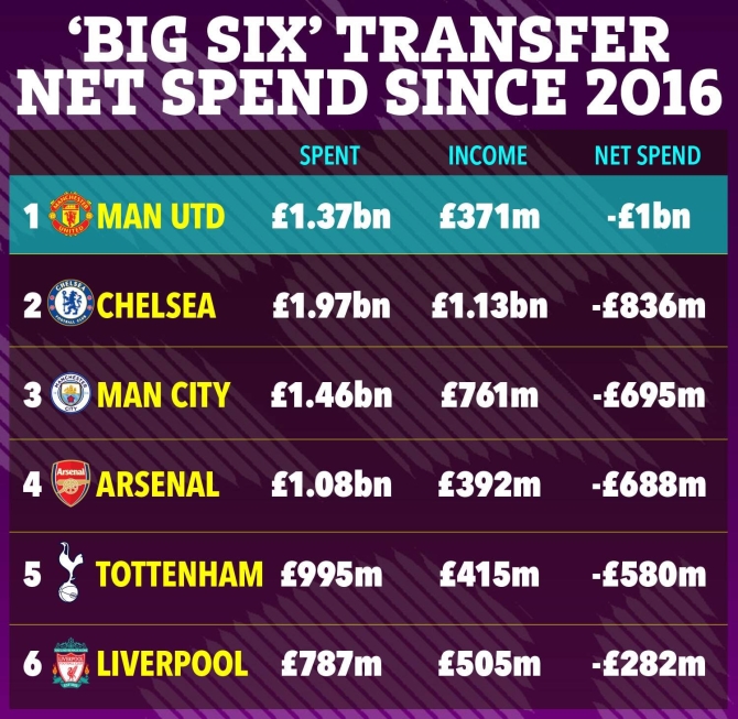 2016年以來(lái)英超BIG6支出、收入、凈支出排行(單位:英鎊):