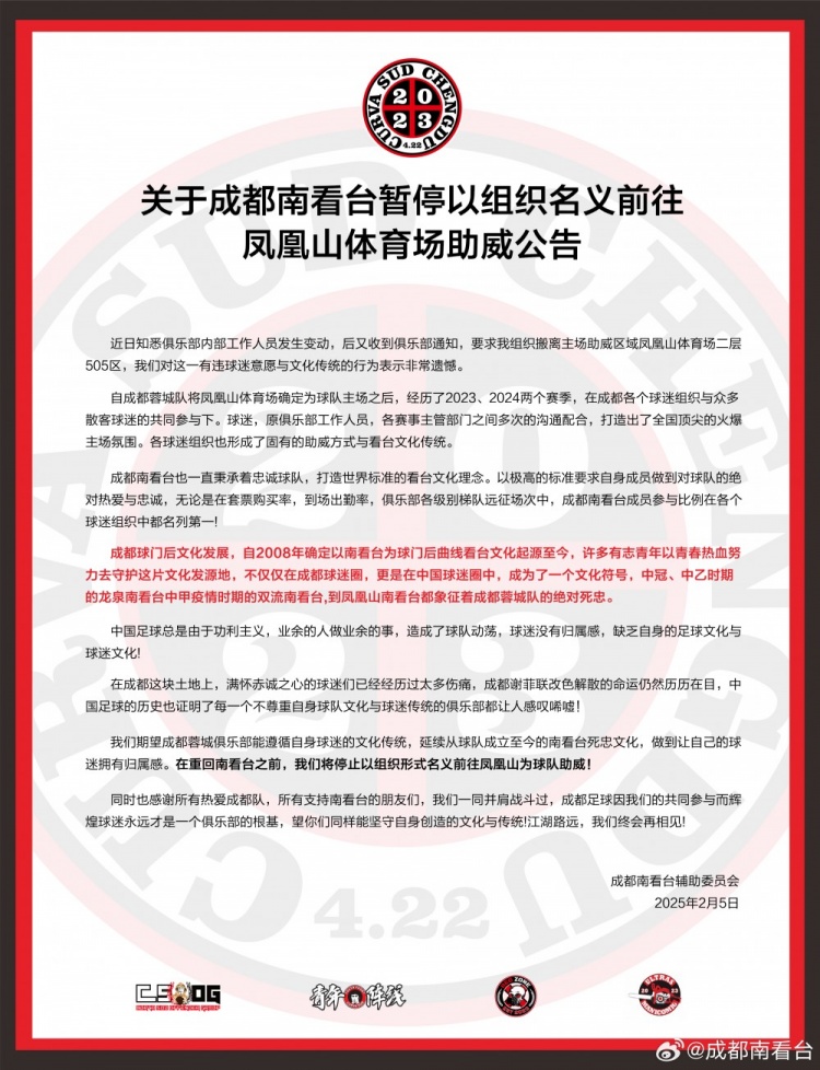 近日知悉俱樂部內部工作人員發(fā)生變動,后又收到俱樂部通知,要求我組織搬離主場助威區(qū)域鳳凰山體育場二層505區(qū),我們對這一有違球迷意愿與文化傳統(tǒng)的行為表示非常遺憾。