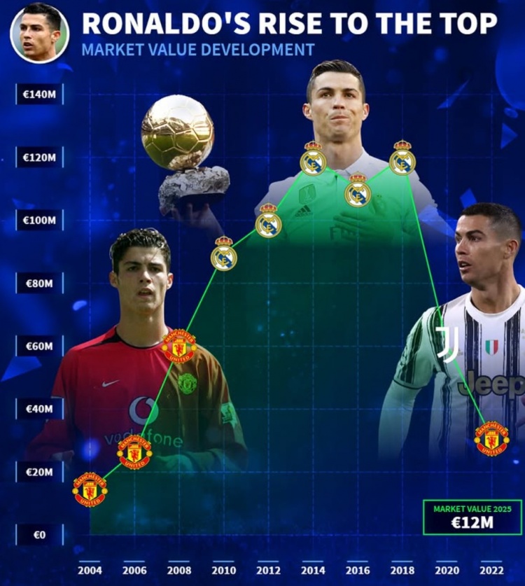 2月6日訊 C羅在今日迎來40歲生日,《轉(zhuǎn)會(huì)市場(chǎng)》也列出了他生涯身價(jià)變化軌跡圖。