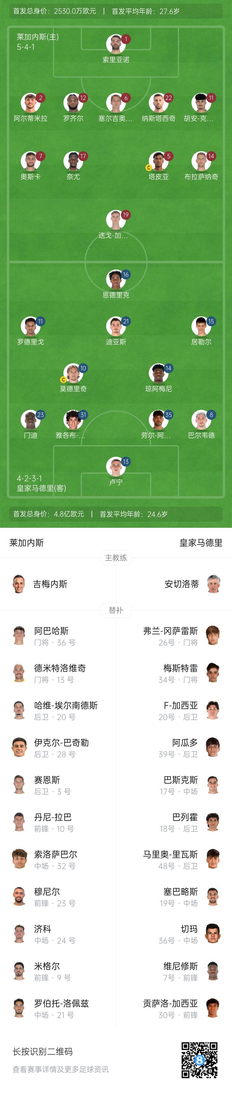 萊加內(nèi)斯替補(bǔ):13-德米特洛維奇、36-阿巴哈斯、3-豪爾赫-薩恩斯、9-米格爾-德拉富恩特、10-丹尼-拉巴、20-哈維-埃爾南德斯、21-羅伯特-洛佩斯、23-穆尼爾、24-朱利安-濟(jì)科、28-伊克爾-巴奇勒、32-索洛薩巴爾