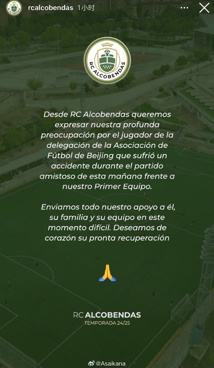 西班牙RC阿爾科文達(dá)斯足球俱樂部官方發(fā)布一條動態(tài)稱,2月6日該隊與來訪的北京球隊進(jìn)行友誼賽時,北京隊一名球員遭遇嚴(yán)重事故,該隊在公告中表達(dá)了關(guān)切和祈福。