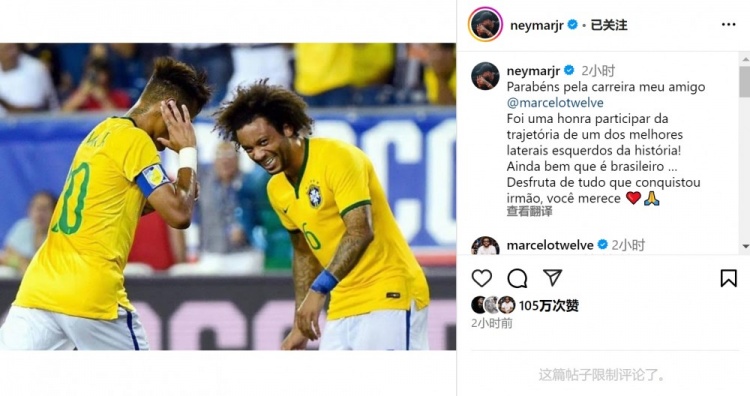 內(nèi)馬爾曬出與馬塞洛在巴西隊(duì)的合照,并寫道:“祝賀你度過精彩的職業(yè)生涯,我的朋友馬塞洛?!?/p>