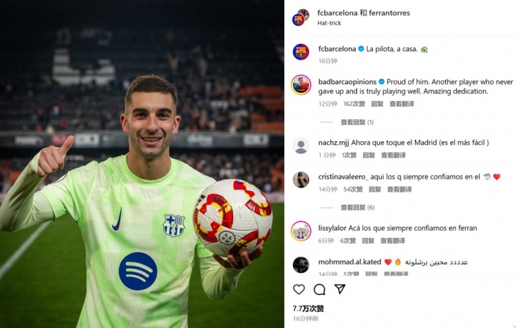 2月7日訊 巴薩在本輪國王杯5-0大勝瓦倫西亞,費蘭-托雷斯開場30分鐘便上演帽子戲法。他也在賽后通過社媒曬出自己手持比賽用球的照片,并未附加文字內容。而巴薩俱樂部官方賬號則現(xiàn)身評論區(qū):“帶球回家?!?/p> 本文標簽: 足球 西甲 巴塞羅那 瓦倫西亞