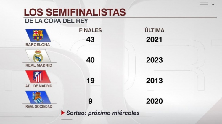 ESPN統(tǒng)計(jì)了四支半決賽球隊(duì)歷史上晉級(jí)國(guó)王杯決賽的次數(shù),巴薩以43次居首,皇馬40次第二。