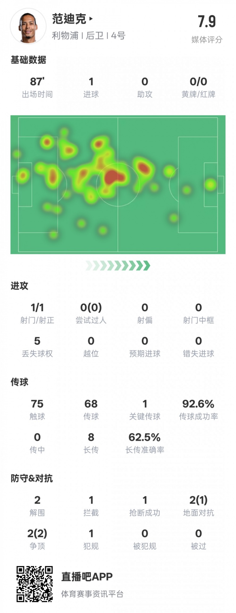 2月7日訊 英聯(lián)杯半決賽,利物浦4-0熱刺,范迪克首發(fā)出戰(zhàn),貢獻1粒進球,還有1次關鍵傳球,2次解圍,1次攔截,評分7.9。范迪克本場比賽數(shù)據(jù)如下:進球1助攻0射門1射正1丟失球權5觸球75傳球68關鍵傳球1傳球成功率92.6%長傳8長傳準確率62.5%解圍2攔截1搶斷1地面對抗2地面對抗成功1爭頂2爭頂成功2犯規(guī)1 本文標簽: 足球 英超 利物浦 范迪克