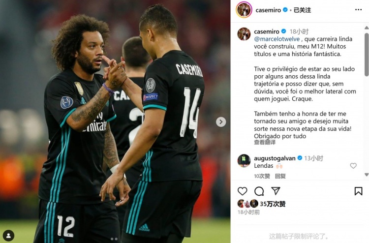 卡塞米羅配文寫道:“你擁有如此精彩的職業(yè)生涯,我的M12,無數(shù)冠軍以及一個(gè)傳奇的故事。很榮幸在你精彩的生涯能與你做幾年的隊(duì)友,我可以毫無疑問的說,你是我所搭檔過最好的邊衛(wèi)。一顆明星。我也很榮幸能與你成為朋友,祝你在新的人生階段一切好運(yùn),感謝你所做的一切。”