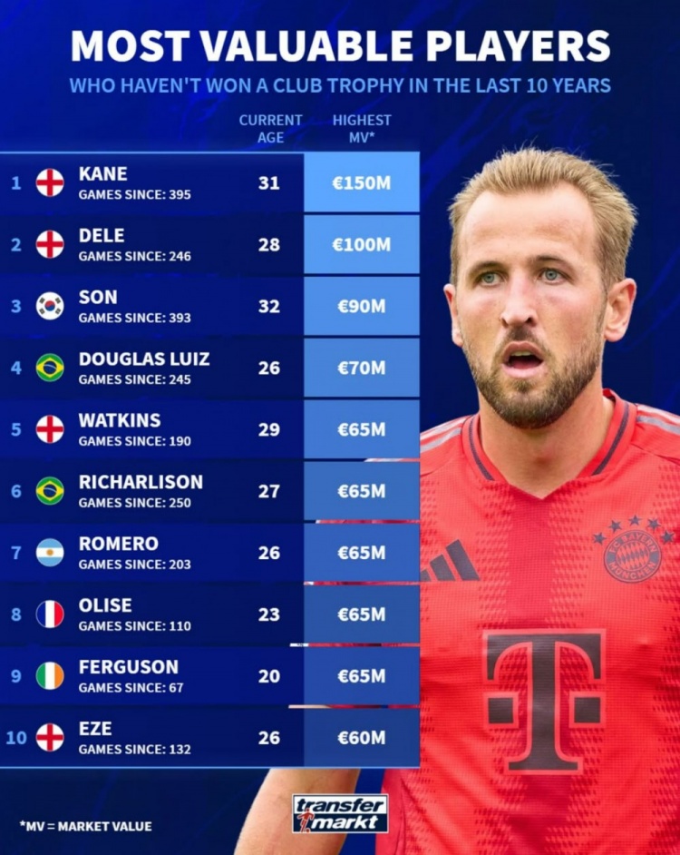 2月7日訊 德轉(zhuǎn)盤(pán)點(diǎn)了近10年在俱樂(lè)部不曾獲得冠軍球員最高身價(jià)榜,其中凱恩以1.5億歐居首,以下為具體榜單(身價(jià)為球員歷史最高身價(jià)):