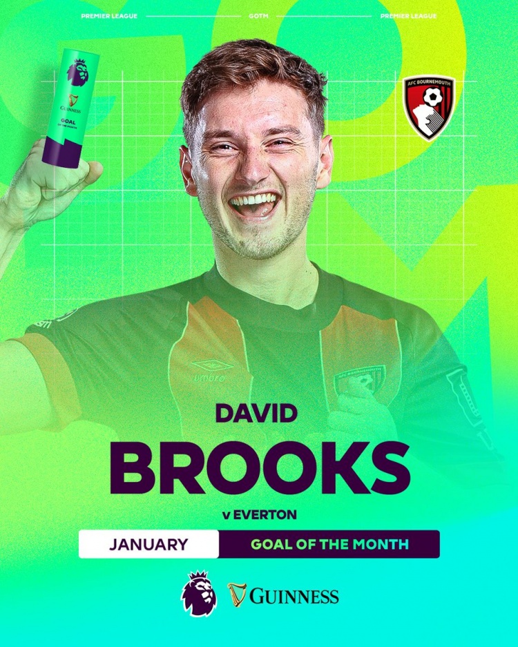 在伯恩茅斯主場對陣埃弗頓的英超第20輪比賽中,布魯克斯第77分鐘接米洛什傳中凌空端射破門,幫助伯恩茅斯1-0取勝。英超官方宣布,布魯克斯的這腳凌空破門當選英超1月最佳進球。