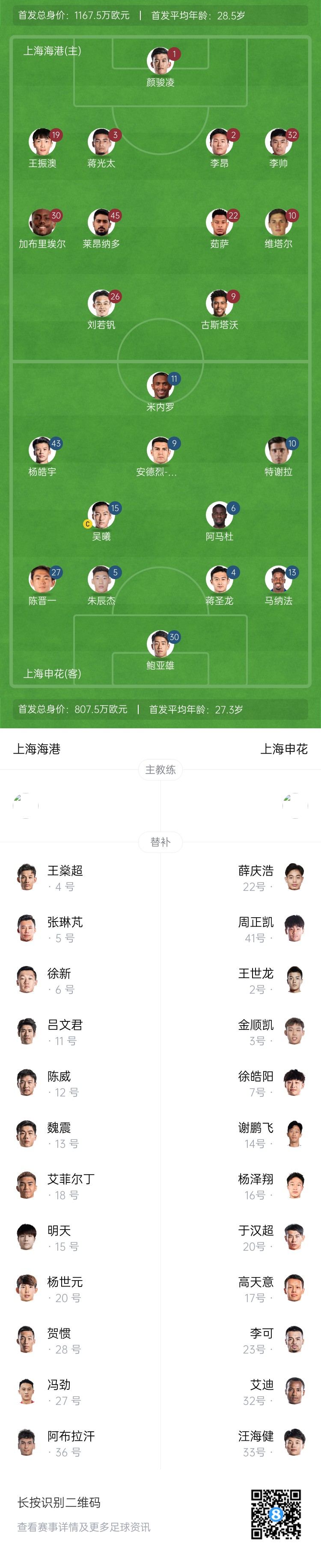 上海申花替補(bǔ):1-薛慶浩、41-周正凱、2-王世龍、3-金順凱、7-徐皓陽(yáng)、14-謝鵬飛、16-楊澤翔、17-高天意、20-于漢超、23-李可、32-艾迪、33-汪海健