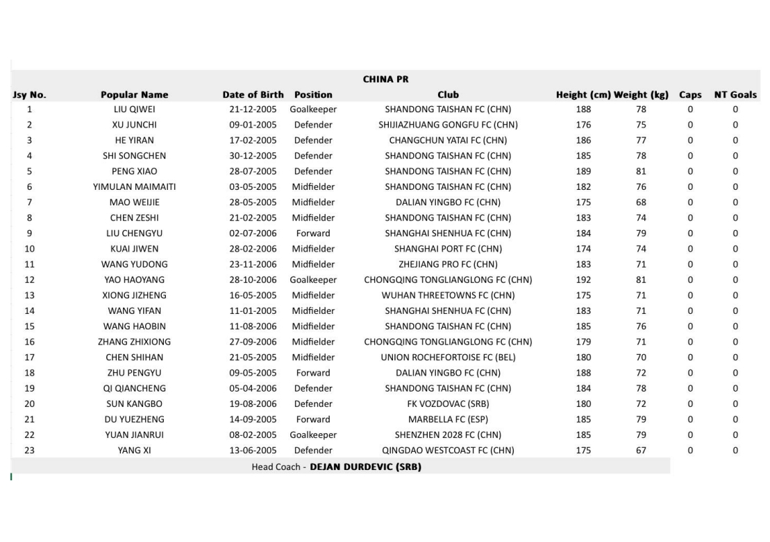 后衛(wèi):2-徐俊馳(石家莊功夫)、3-賀一然(長(zhǎng)春亞泰)、4-史松宸(山東泰山)、5-彭嘯(山東泰山)、19-齊千程(山東泰山)、20-孫康博(塞爾維亞沃日多瓦茨)、23-楊希(青島西海岸)