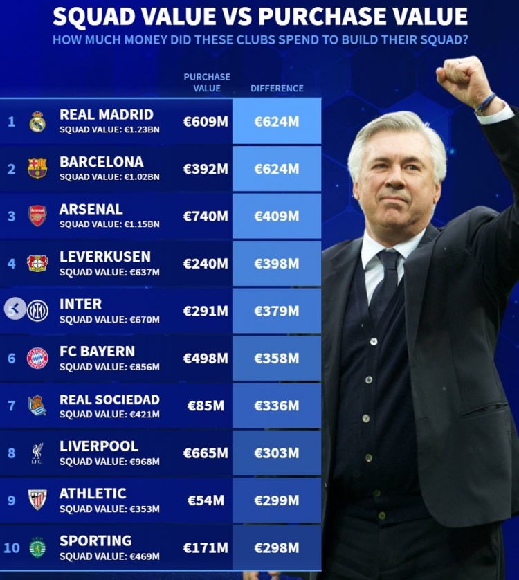 2月8日訊 《轉(zhuǎn)會(huì)市場(chǎng)》統(tǒng)計(jì)了當(dāng)前陣容身價(jià)高于引進(jìn)費(fèi)用情況,皇馬巴薩并列居首。