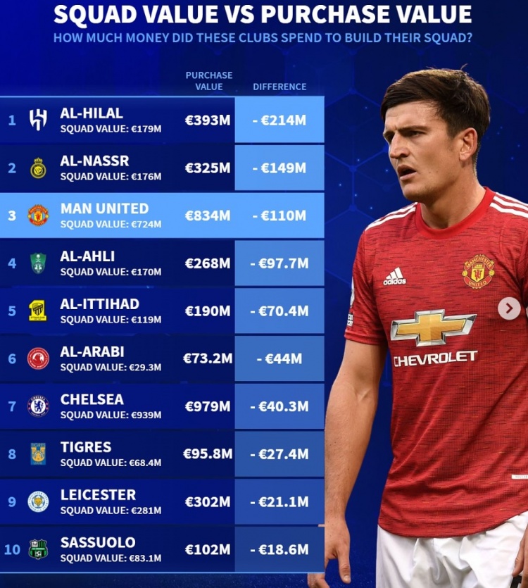 2月8日訊 《轉(zhuǎn)會(huì)市場(chǎng)》統(tǒng)計(jì)了當(dāng)前陣容身價(jià)低于引進(jìn)費(fèi)用情況,前5名中有4支沙特球隊(duì)。