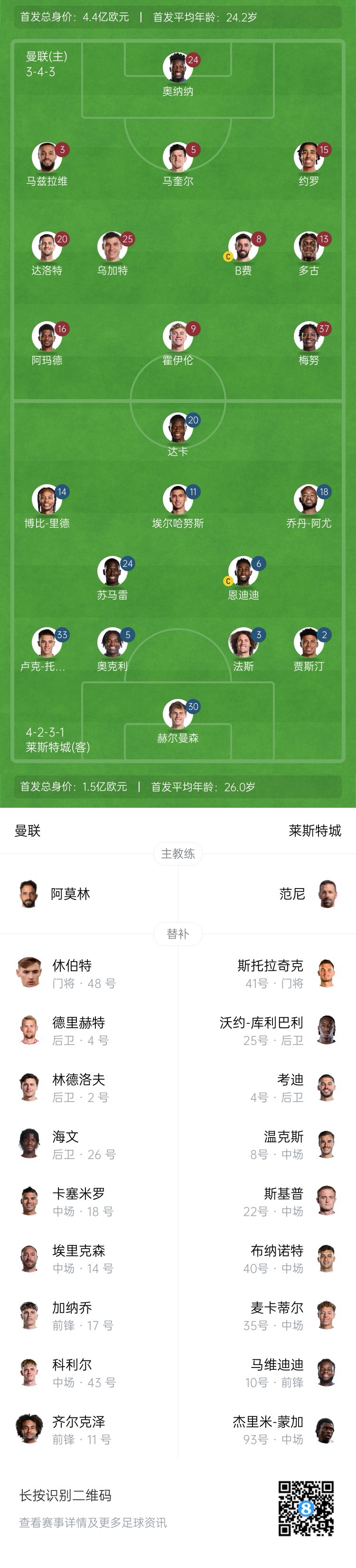 曼聯(lián)首發(fā):24-奧納納、3-馬茲拉維、5-馬奎爾、15-約羅、20-達洛特、25-烏加特、37-梅努、13-多古、8-B費、16-阿瑪?shù)?迪亞洛、9-霍伊倫