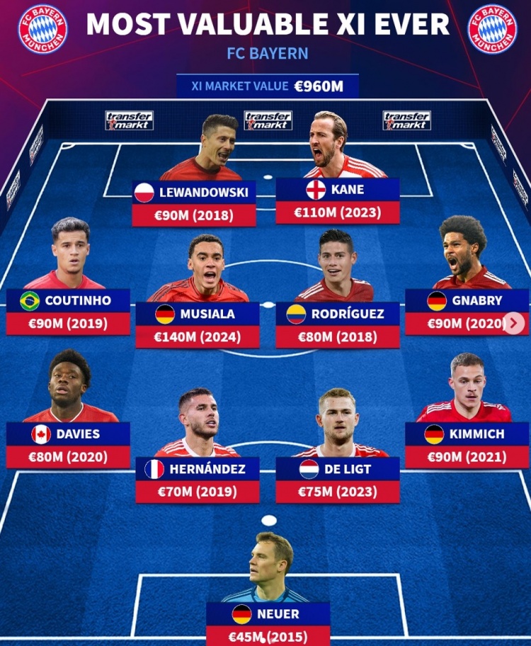 德轉(zhuǎn)列拜仁球員歷史身價(jià)最貴陣:總身價(jià)9.60億歐元