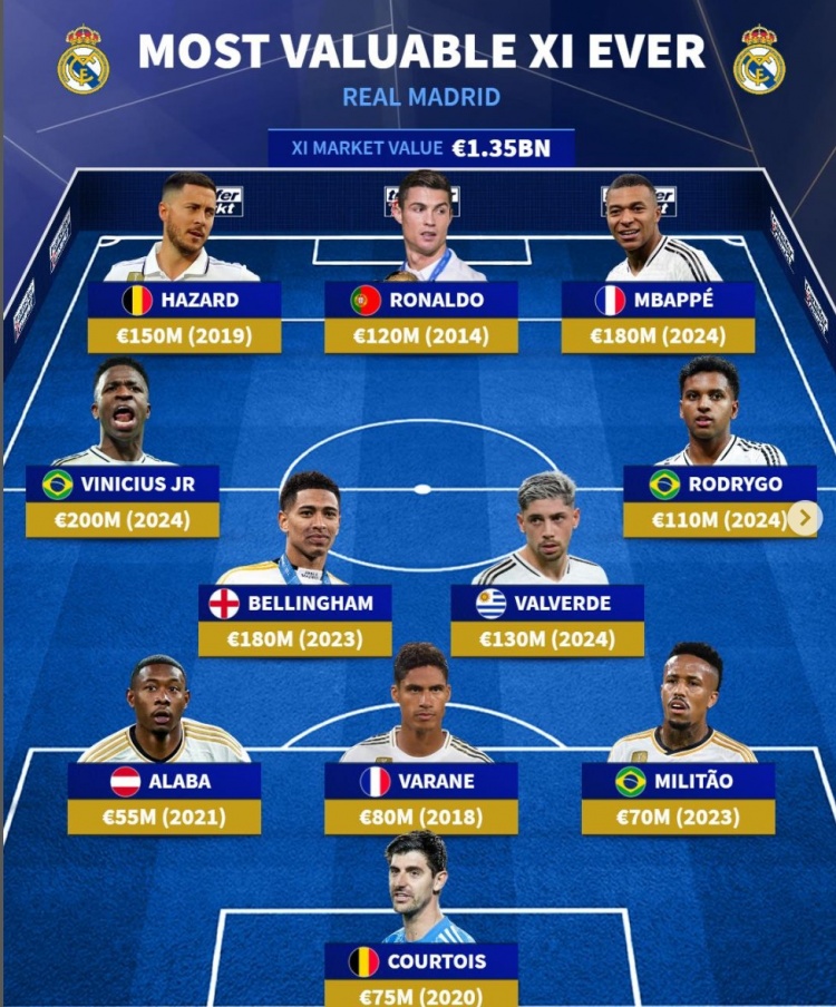 前鋒:阿扎爾(2019,1.5億)、C羅(2014,1.2億)、姆巴佩(2024,1.8億)