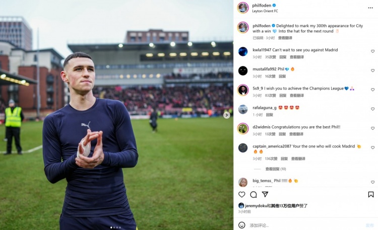 2月9日訊 在本輪足總杯曼城2-1擊敗萊頓東方的比賽中,福登替補登場。福登也達成了曼城生涯300次出場里程碑,賽后他在個人社媒曬出本場照片,配文寫道:“很高興能以一場勝利紀念自己的曼城300場之戰(zhàn),挺進足總杯下一輪!” 本文標簽: 足球 英超 曼城