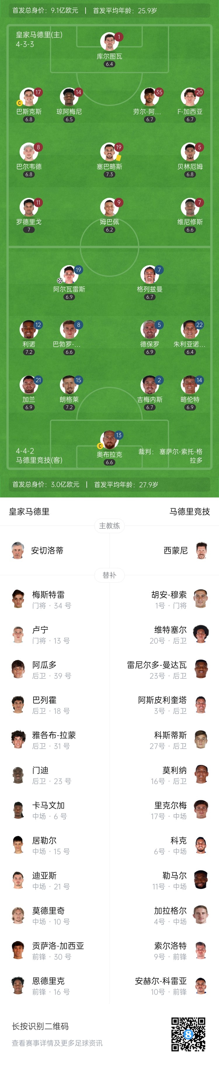 2月9日訊 北京時(shí)間4:00,西甲第23輪迎來榜首大戰(zhàn)!皇馬主場(chǎng)迎戰(zhàn)馬競(jìng),比賽在伯納烏球場(chǎng)打響。上半場(chǎng),瓊阿梅尼送點(diǎn),安切洛蒂掩面!阿爾瓦雷斯勺子點(diǎn)球破門!半場(chǎng)結(jié)束,馬競(jìng)暫時(shí)1-0領(lǐng)先皇馬。
