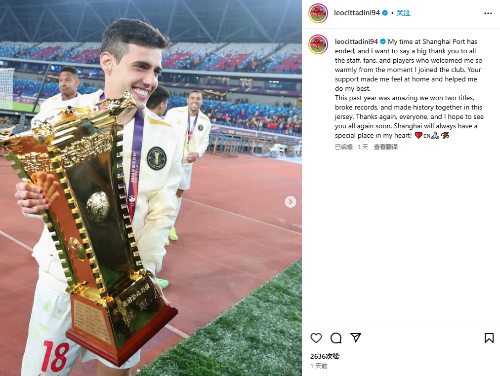 過去的一年太棒了,我們獲得了兩個(gè)冠軍,身穿這件球衣創(chuàng)造了俱樂部的歷史。再次感謝大家,希望很快能夠再次相遇。上海在我心中永遠(yuǎn)占據(jù)著特別的位置!