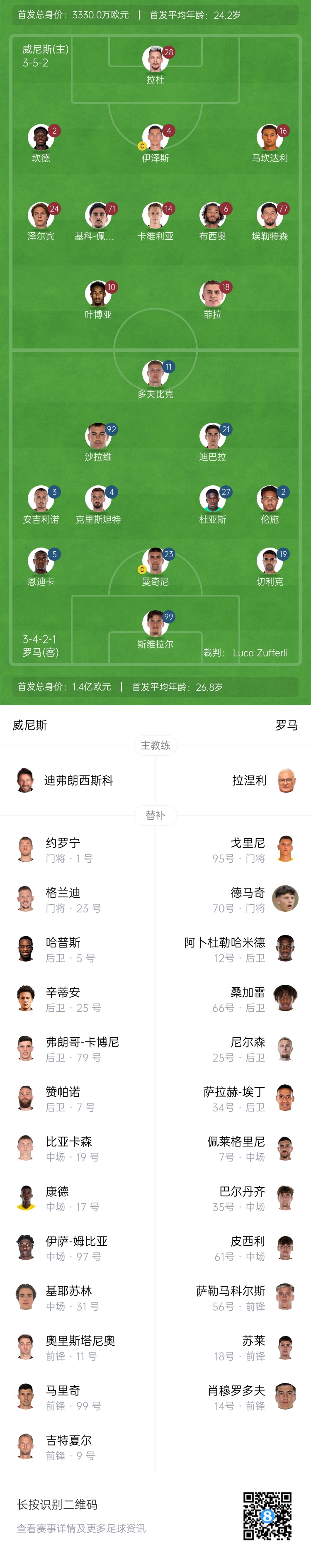 威尼斯首發(fā):28-拉杜、16-馬坎達利、4-埃澤斯、2-坎德、71-基科-佩雷斯、14-卡維利亞、6-布西奧、24-澤爾賓、77-埃勒特森、18-菲拉、10-耶博阿