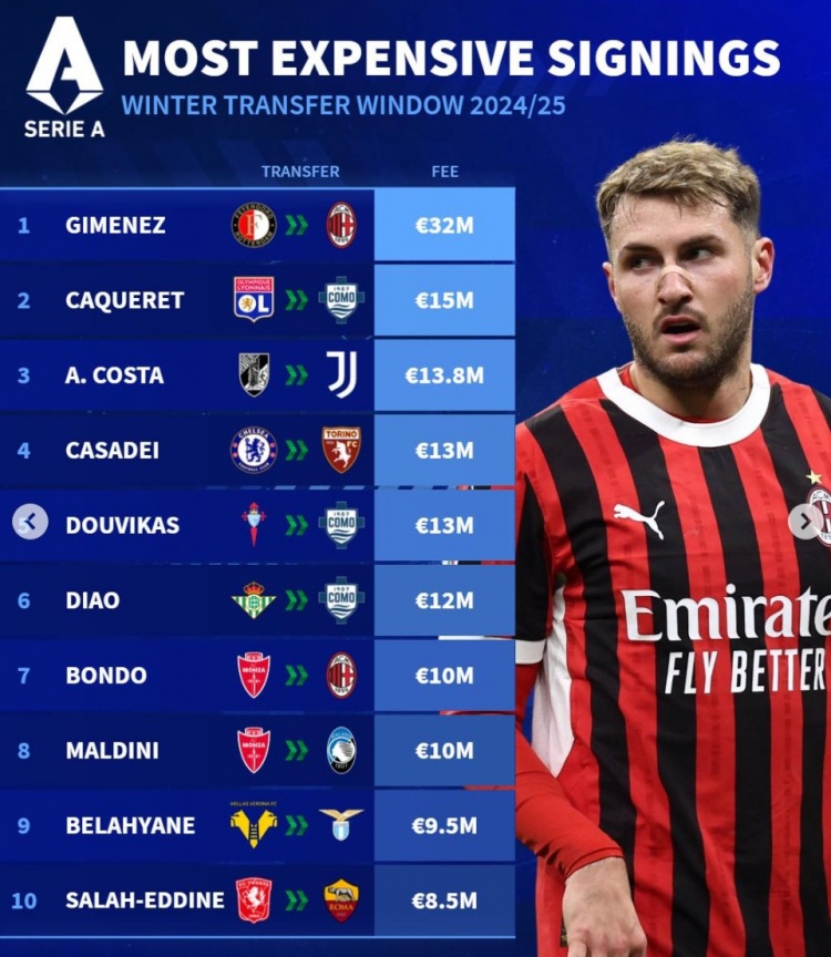 2月10日訊 五大聯(lián)賽冬窗已經(jīng)結(jié)束,《轉(zhuǎn)會市場》也列出了意甲冬窗引援最貴榜單,米蘭中鋒圣地亞哥-希門尼斯領(lǐng)銜。