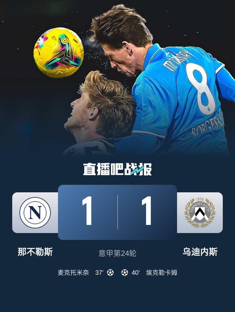意甲第24輪,那不勒斯1-1戰(zhàn)平烏迪內(nèi)斯。上半場,麥克托米奈率先打破僵局;??死湛钒馄奖确?。下半場,雙方均無建樹。