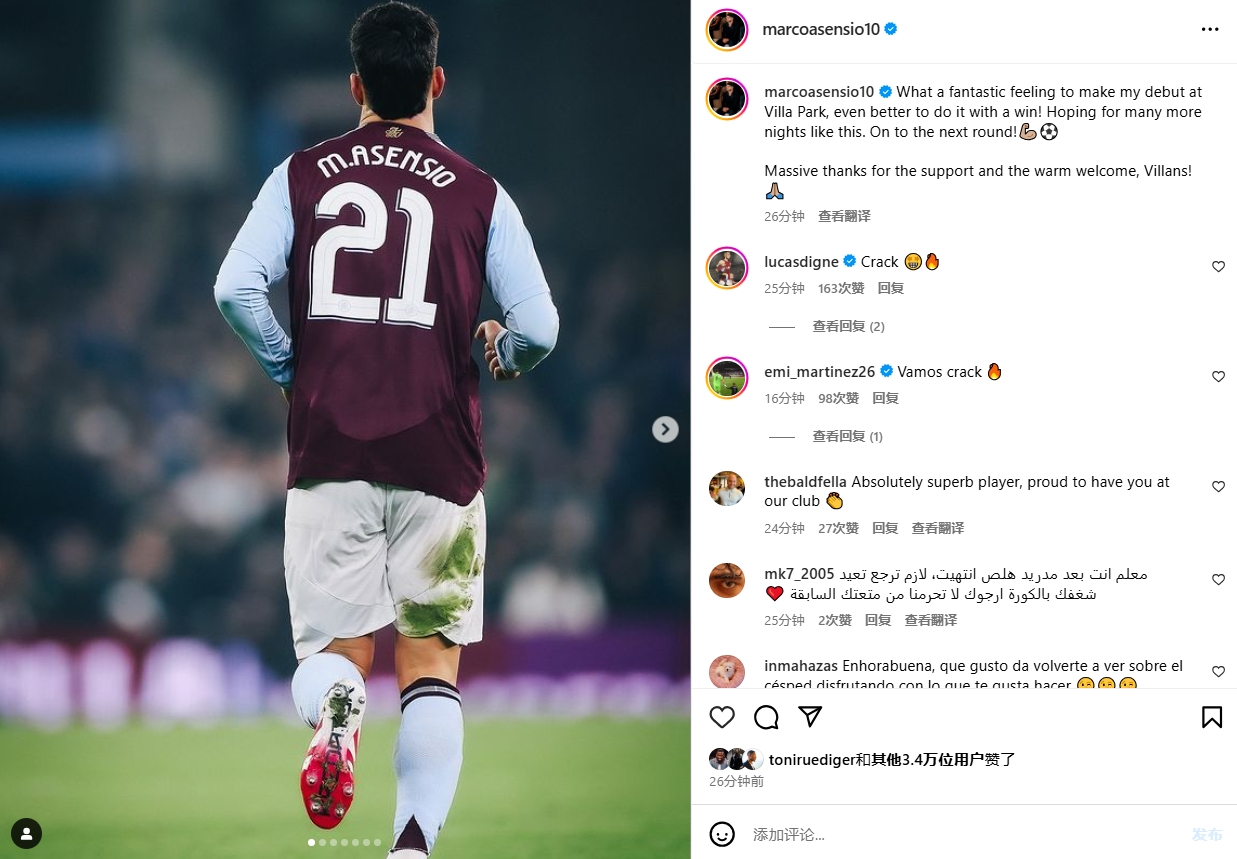 2月10日訊 阿斯頓維拉在本輪足總杯主場(chǎng)2-1擊敗熱刺,從巴黎租借而來的阿森西奧替補(bǔ)完成首秀。他也在賽后通過社媒曬出自己的比賽照,并配文:“在維拉公園的首次亮相真是太棒了,取得勝利讓這感覺更好了!期待未來能有更多這樣的夜晚。晉級(jí)下一輪!??????????非常感謝你們的支持和熱烈歡迎,維拉球迷們!” 本文標(biāo)簽: 足球 英超 熱刺 阿斯頓維拉 法甲 巴黎圣日耳曼